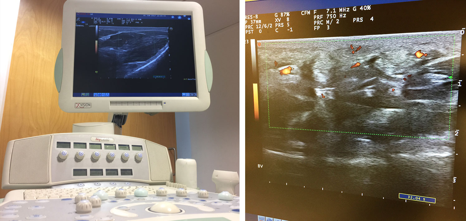 En la actualidad es considerada como una prolongación de la exploración física y es fundamental en la asistencia clínica diaria del reumatólogo. Otra aplicación esencial es la ecografía intervencionista, que permite guiar las punciones diagnósticas y/o terapéuticas alcanzando la máxima precisión. Disponemos de un ecógrafo de alta resolución en HD: ESAOTE® Mylab 60.